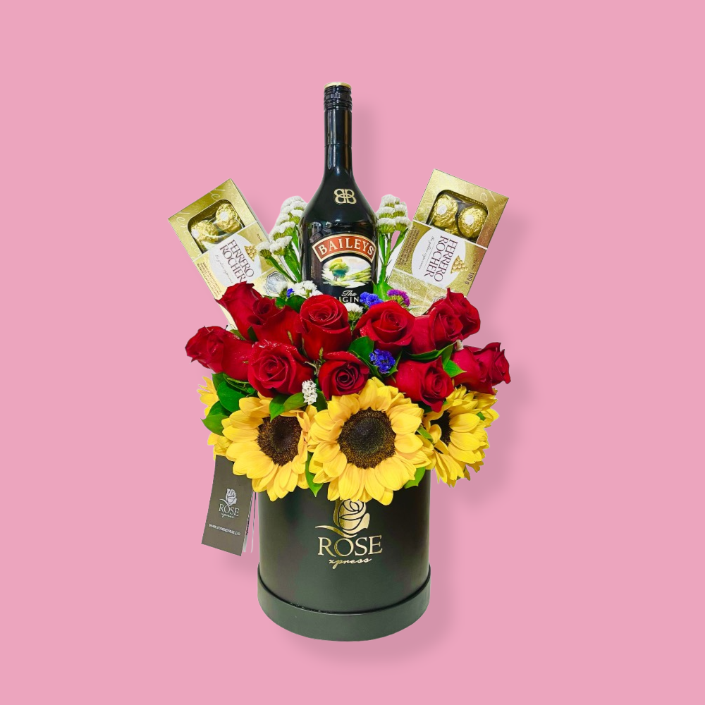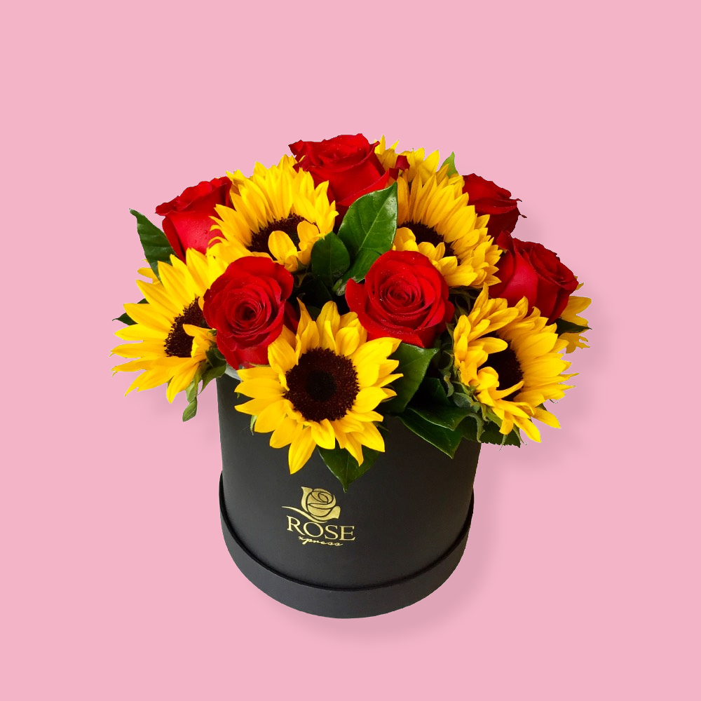Girasoles y 5 Rosas Rojas en Caja Circ.