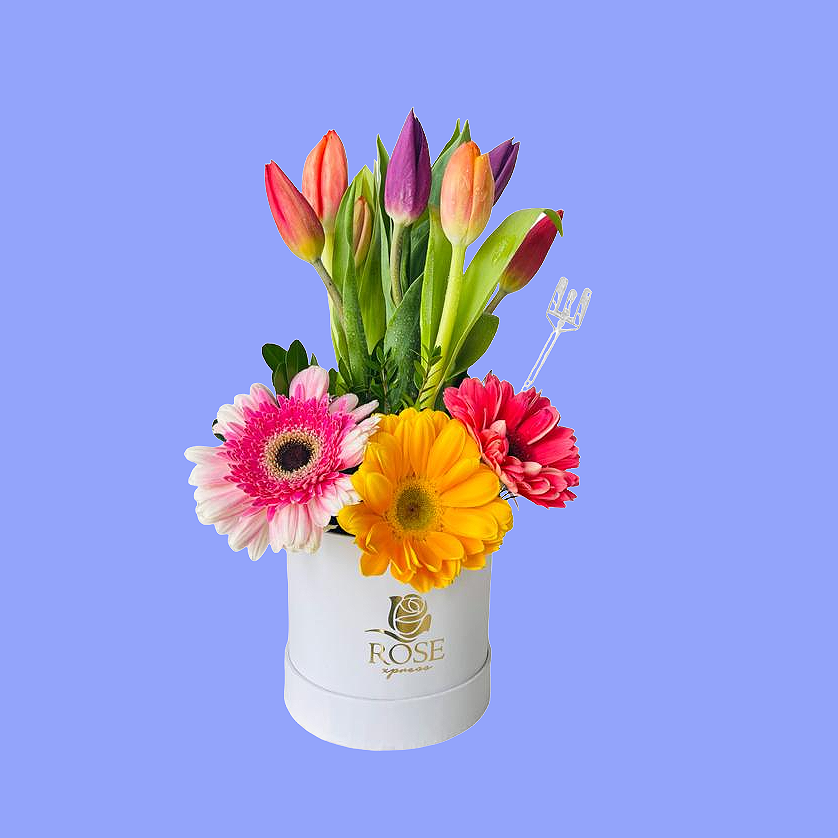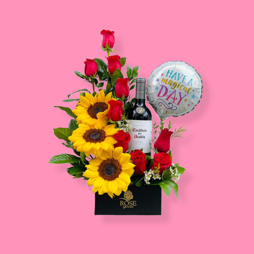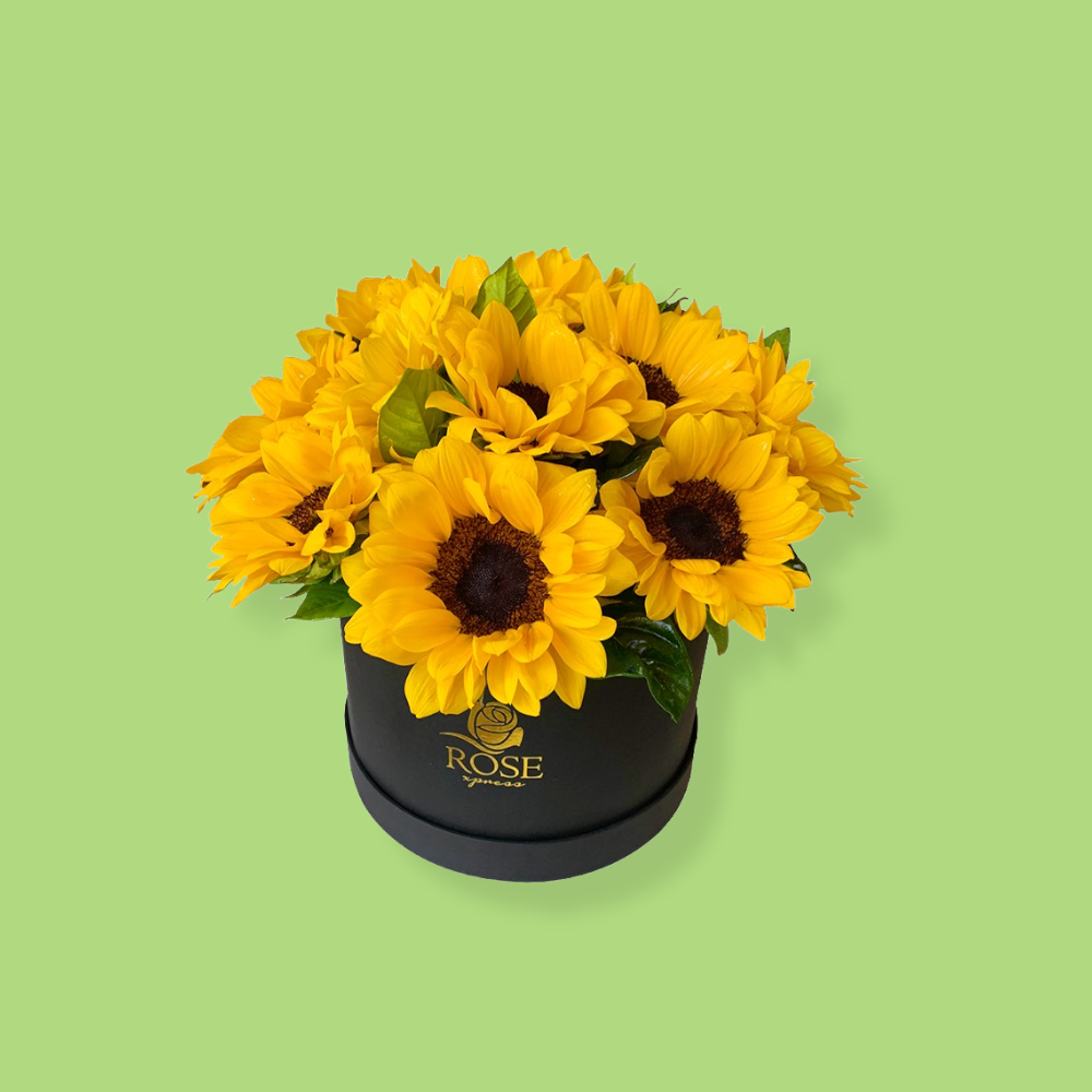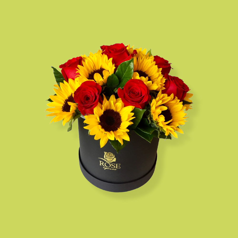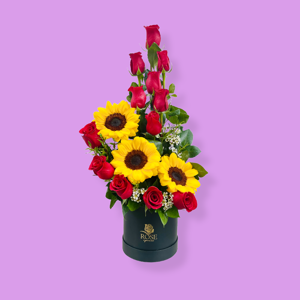 Girasoles y 5 Rosas Rojas en Caja Circular